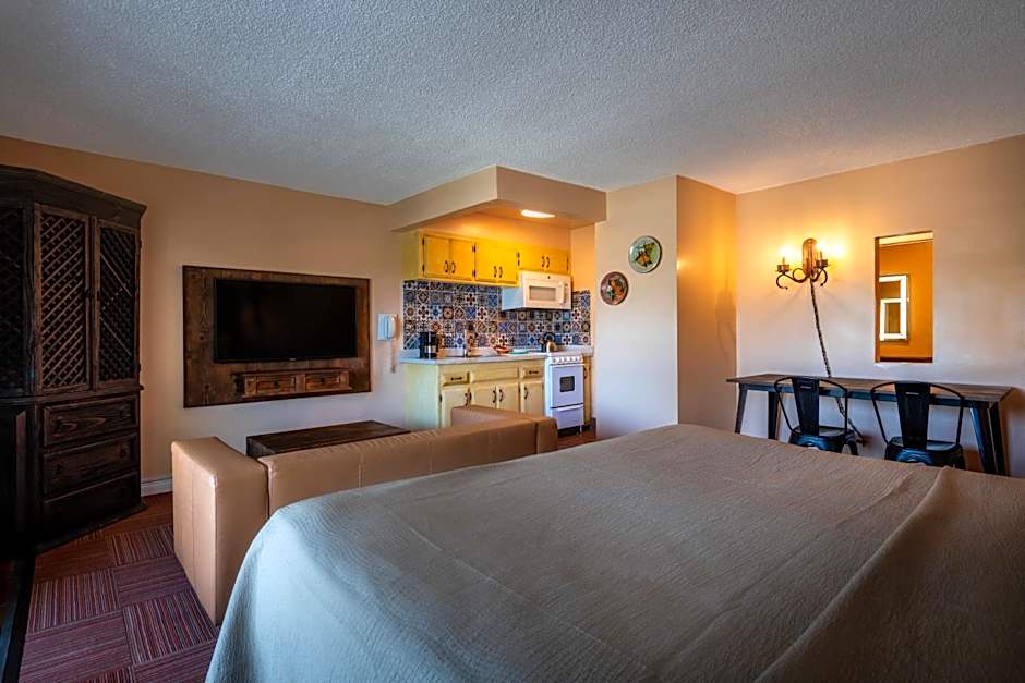 Located on the second and third floors, this studio offers a full kitchen, a king bed, and a private balcony or patio..Silverware and cookware are featured in this studio's full kitchen.